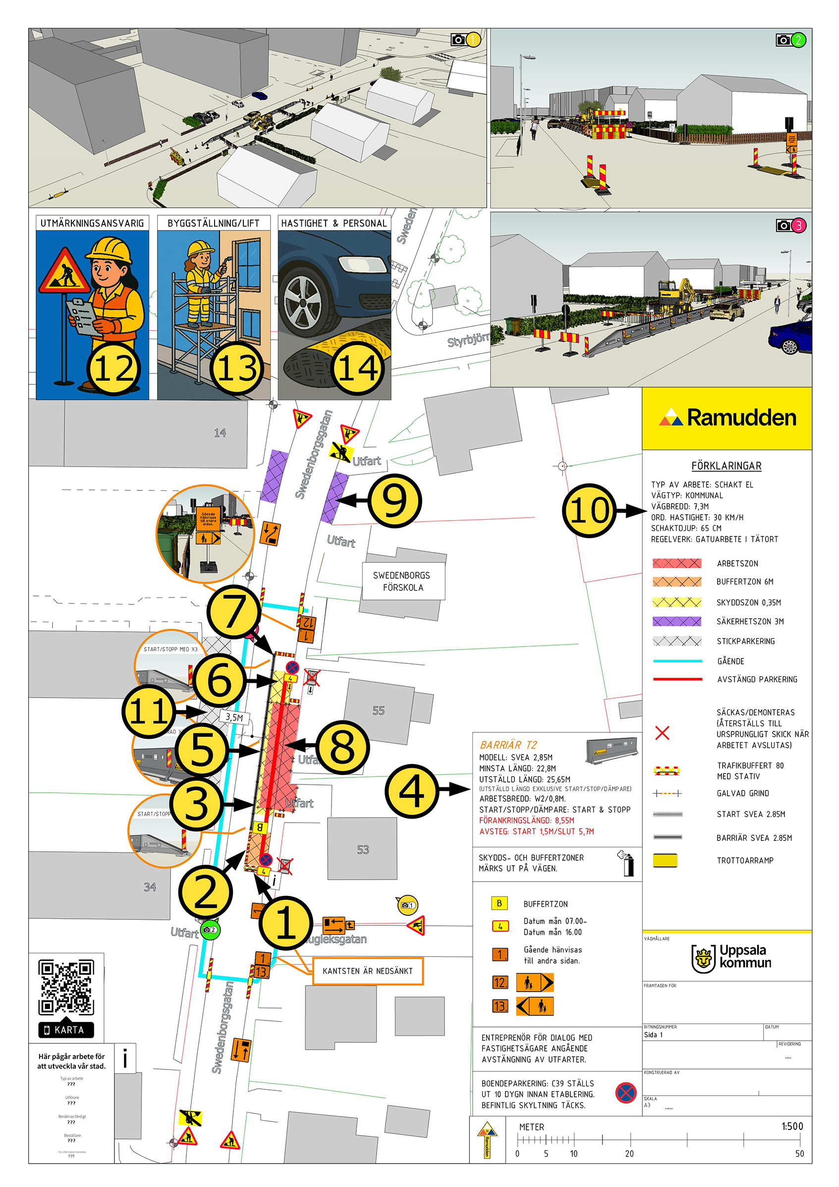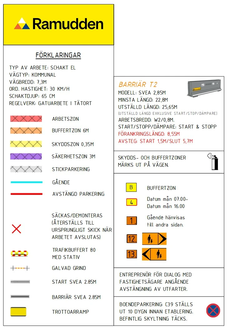 Förankringslängd: 8,55 m X 2 - Minsta förankringslängd yta före och efter arbetszonen i uppställd längd, detta enligt tillåtelsebeslut från Trafikverket.